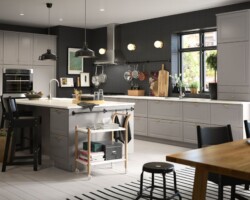 Inspirerande produktbild för IKEAs hemsida. BODBYN grå lucka i fokus.