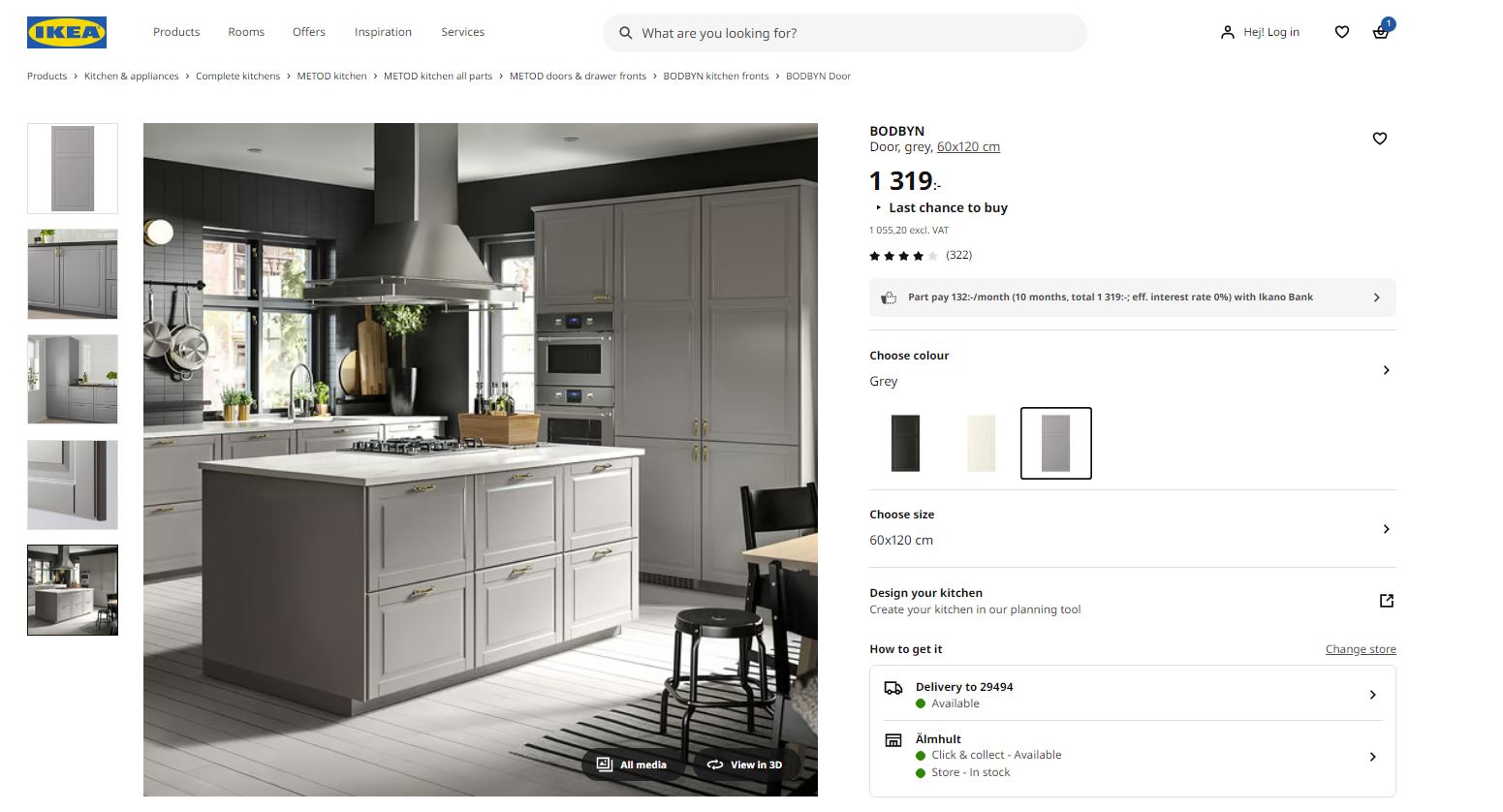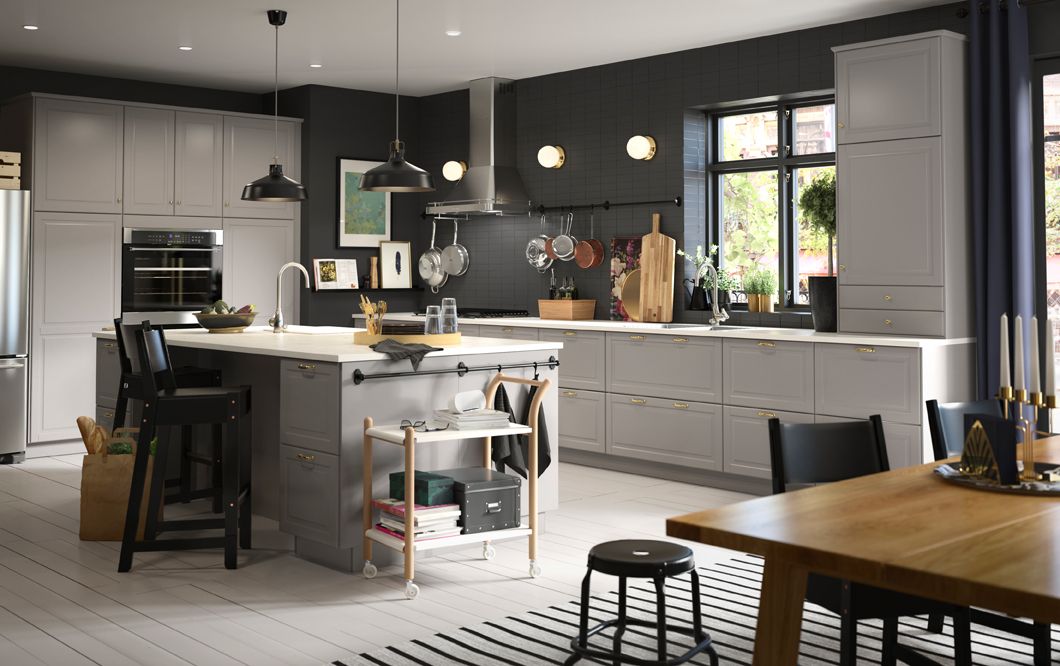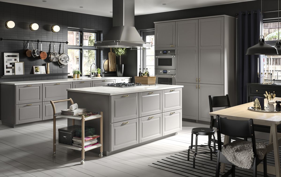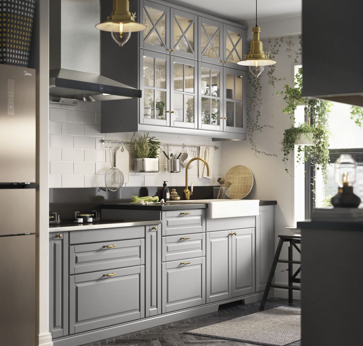 Inspirerande produktbild för IKEAs hemsida. BODBYN grå lucka i fokus.