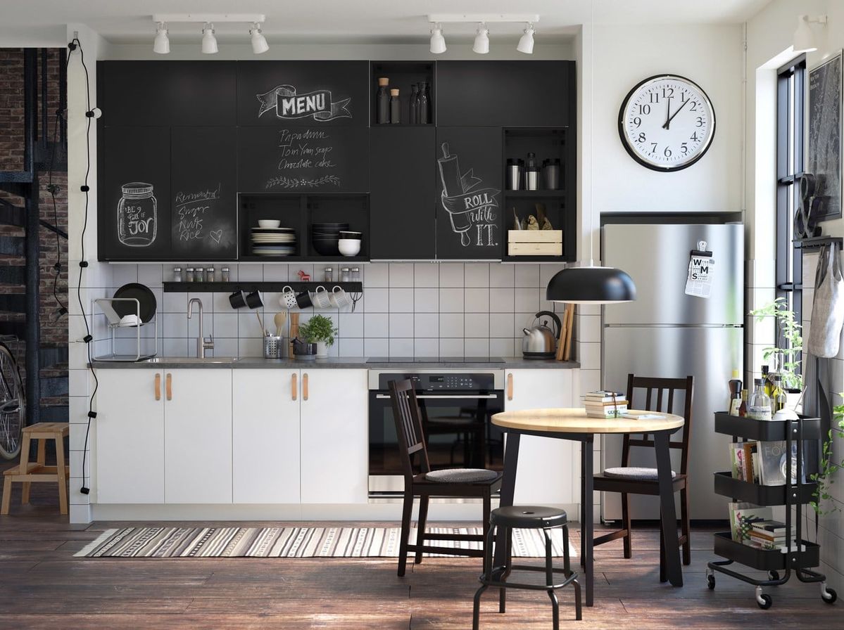 Svarta griffeltavla luckor mixade med vita till ett grafiskt och personligt kök.
