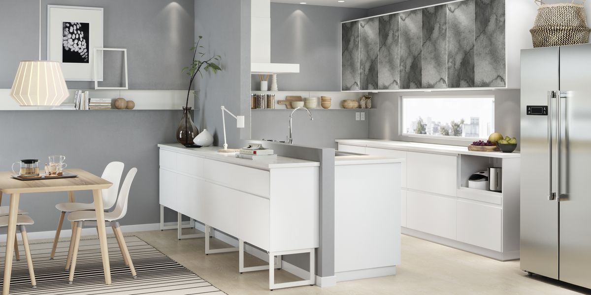 Lucka VOXTORP vit matt / Bänkskiva EKBACKEN stenmönstrad / Ugn och Micro utgående produkter / Vägghylla BOTKYRKA